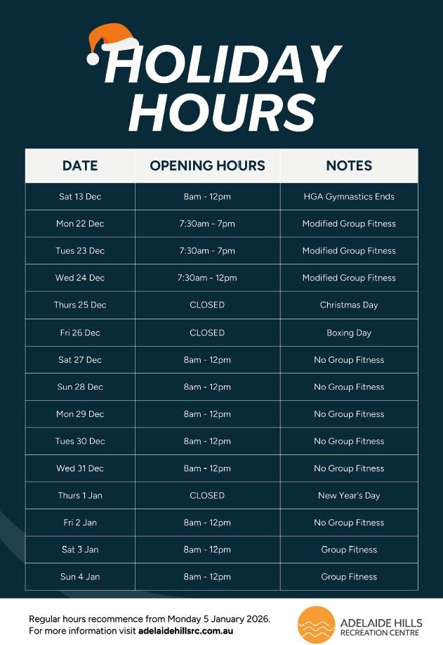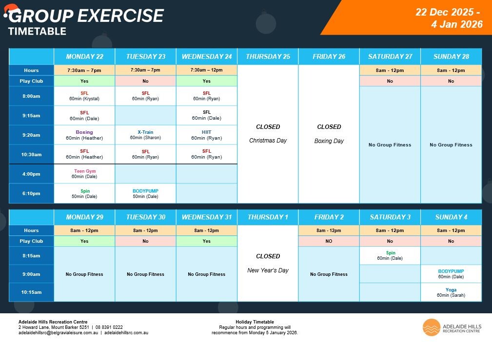 Please note a few changes to our opening hours over the christmas/new years period.We will be running an adjusted Group Fitness timetabe through the christmas/new year period: