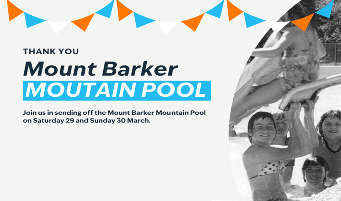 As a final farewell to Mount Barker Mountain Pool, the pool will be hosting a weekend send off on Saturday 29 and Sunday 30 March. Entry to the venue will be free between 11am – 6pm. Guests are encouraged to bring a picnic and enjoy free access to the pool. The pool will be open no matter what the weather!